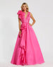V-neck sleeveless ball gown with ruffled shoulder ruched empire waist and ruffles flowing down the skirt.