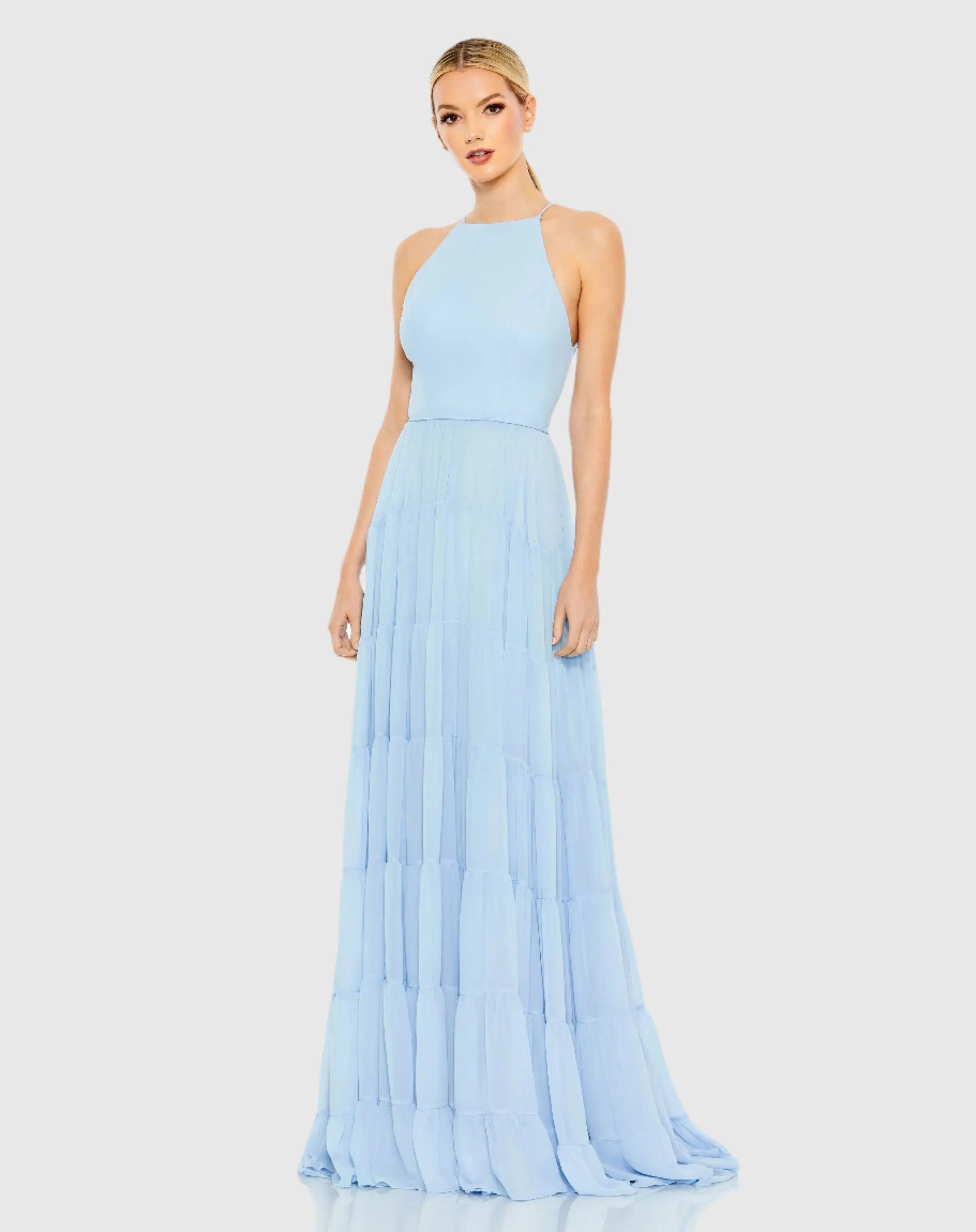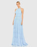 Striking high neck halter gown with a ruffle-tiered skirt.