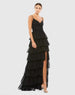 Crafted from airy chiffon fabric, this sleeveless gown features a ruffled tiered skirt for a stunning and feminine silhouette. The thigh-high slit adds a touch of allure, while the ruched bodice provides intricate detailing.